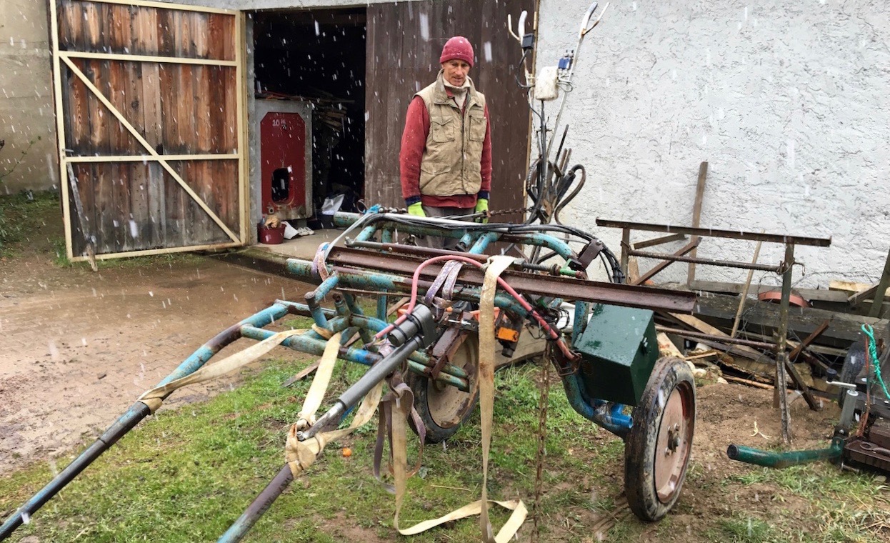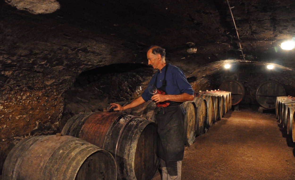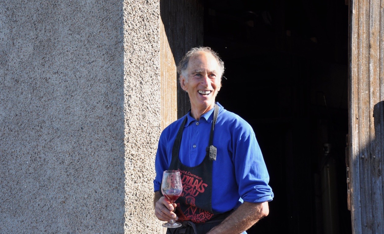 1971年からワインつくりを始め、1980年にはすでに有機栽培を実践していたクリスチャン・デュクロー。ボジョレーだけでなく、フランス全体を見渡しても指折り数えるヴァンナチュールの先駆者の一人です。淡々と誠実に日々の畑仕事をこなし、素朴で静かな生活を大切するクリスチャンは、ほとんどサロン(試飲会)やイベントなどに参加することがありません。長年にわたり自然体で畑仕事と向き合ってきたクリスチャンは、彼自身がナチュールを体現しているような存在です。ナチュールとは、生き方とは、そんな哲学を彼自身が語り啓蒙することはありませんが、50年以上にわたり自然をリスペクトし畑と向き合い、ワインつくりを続けてきた彼の存在そのものが「ナチュールとは」を無言で語りかけます。わずか6.5haの畑。畑に生える草木や周囲の自然を大切にしながら、ビオディナミのカレンダーに沿って栽培。ボジョレーの他の畑と比べてもブドウの樹と樹の間にゆとりがある畑には、ブドウと一緒にリンゴの木やアプリコットの木が植えられ、他では見た事のない不思議な空間です。畑のすぐ隣には彼の育てる野菜畑があり、ガチョウや鶏を飼育しています。訪問中、ふとクリスチャンが飼育小屋の柵を開けると、ガチョウや鶏がブドウ畑の中を所狭しと走り回りはじめました。それを透き通るような瞳と優しい笑顔で見守るクリスチャン。青空の下、ブドウ畑と足元に生える豊富な草木や根菜、高さのあるアプリコットやリンゴの木にはその上でさえずる小鳥たち、心地よく走り回る小動物たち...言葉を必要としない、心と体で感じるクリスチャンの哲学。感動的なヴィニュロンです。カイナとエルバと名付けられたクリスチャンの愛馬とともに畑を耕作。50年に渡る誠実な畑仕事の中で、根は地中深くまで伸び、土の中もふかふかです。見上げる空から目の前のブドウ畑、そして土の中も、全てが大きな自然循環の営みの中にあることを肌で感じ、その中に立っている私たちの生物としての感覚も研ぎ澄まされ開放されてゆく感覚。「育み食す」人が誕生してから長い年月そうしてきたシンプルな「農」という概念は、人が生きていく上で切っても切り離せないものだけど、その中にこれだけの大きな「自然」を残すことができる。「50年間畑と向き合ってきたけど、10年ほど前からやっと少しずつ、自然や畑が理解できるようになってきた。」と語るクリスチャン。「土があり畑がありブドウがあってその先にワインがある。根幹にあるものが良くないと外部からいろんなものを足さなくてはいけない。根幹にある土が良くないと良いワインはできない。」それぞれの言葉の重みを感じます。彼の哲学・思考、目に映る畑が私たちの心に忘れかけていたものへの"気づき"を与えてくれます。感動的で学ぶことの多い素晴らしい生産者です。