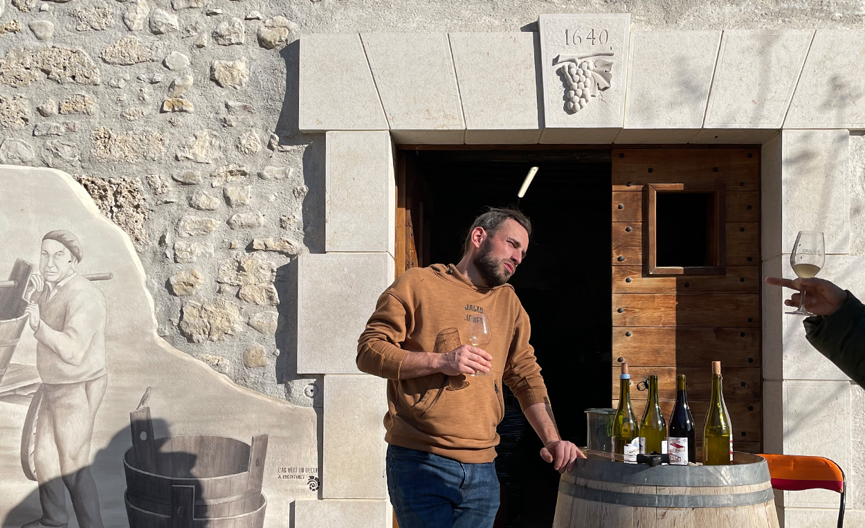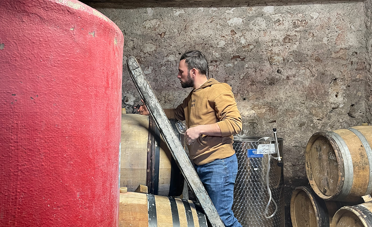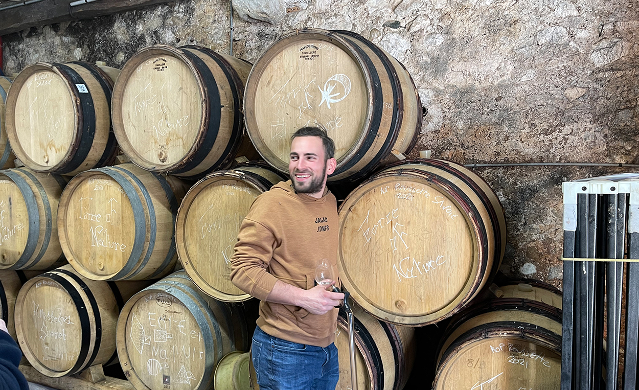 カーヴの裏にそびえる切り立った山Gros Foug(グロ・フグ)の南西向斜面に広がる美しい畑。氷河期に形成されたモラスと呼ばれる砂岩と石灰質がセメントのようになった固い土壌。これが溶解し石英の砂になり濾過性が高く乾燥に強いブドウに適した土壌になります。このモラス土壌はブドウの根が張るのがとても大変ですが、液体に燻したような香りや野生的なニュアンス、スパイシーさや力強さと複雑味をワインに与えてくれるそうです。コランタン・ウイヨンはこの美しい畑と土壌に惚れ込み、2020年に畑を所有していたドメーヌ・ドゥ・ヴェロネから5haの畑とカーヴを買い取りました。急な斜面の一枚畑は10haほどありましたが、自分の手の届く範囲でワインをつくりたいと5haのみにしぼり、購入したカーヴに残っていた大きなタンクも売って、小さいタンクだけを残しました。古い歴史を持つドメーヌのカーヴはその昔すぐそばにあるChâteau de Fortisの付属施設だったもので1940年に建てられ、いまもその歴史の名残を感じられます。畑には赤と白品種合わせて5品種が植えられています。カーヴの裏に広がる畑で収穫したブドウをすぐカーヴに運び込み醸造できるのも彼にとっては理想的だったようです。切り立った山の麓の急な斜面、冷涼な気候、土着品種、まさにサヴォワで生まれるワイン。「モラス土壌で個性を発揮するそれぞれが品種を自然なまま瓶に詰めたい。収穫したブドウが時にロックな味わいになろうとも自然なままに、こうしたいとかこう持っていこうとかしたり、自分に迷いがあるとワインにも迷いが伝わるんだ。」とコランタン。ウイヨンと聞いてピンと来る人もいるかもしれませんが、コランタン・ウイヨンの祖母はエマニュエル・ウイヨンの母親で、エマニュエルはコランタンの叔父にあたります。幼い頃からピエール・オヴェルノワの畑に行き、ワインの剪定や収穫、醸造、そしてパンつくりなどに出会い、自然へのリスペクトのある仕事、情熱や感性を得て育ってきました。その後、ボーヌやモンペリエでワインつくりを学び、ステファン・ティソやドミニク・デュランで働き、叔母にあたるアデリーヌ(ルノー・ブリュイエールの奥さん)で収穫などに携わります。オーストラリアやスイスのワイナリーでも研鑽を積み、最後にこのサヴォワの地に辿り着いたのは、この土地への魅力はもちろんですが、奥さんがサヴォワ出身であることも影響しています。奥さんのリーヌとは2015年から2018年までスイスのDomaine la Ville de Morgesで働いていた時に出会いました。コランタンはバニュルスのブリュノ・デュシェンのようなパッと晴れやかな陽気さのある人柄。訪問中も笑いがたえません。特徴的なエチケットも彼らしい哲学があります。「旗にはいつだって大切なメッセージが込められているだろう。自分で書いたエチケットで手作り感はあるけど、これはコランタン・ウイヨンがつくったワインだって見た人がすぐに分かるようにしたかったんだ。そして四方にあるシンボルは星の動きを表しているんだ。」とコランタン。自然や風土、ワインが瓶に詰められるまでの多種多様な事象へのリスペクト、それに対しての彼自身がすべきことへの深い考慮がなされているのを彼の仕事から感じます。グロ・フグの麓から届けられるナチュラルなテロワールを感じてほしいです。