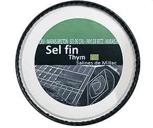 Sel fin thym 120g セル・ファン・タン 原材料:海水94%、タイム6% セル・ファンにオーガニックのタイムを配合してつくられます。色はタイムの緑の色をしています。タイムの香りがパッと爽やかで煮込み料理やパスタ、お魚のグリルやカルパッチョなどにも合います。 |